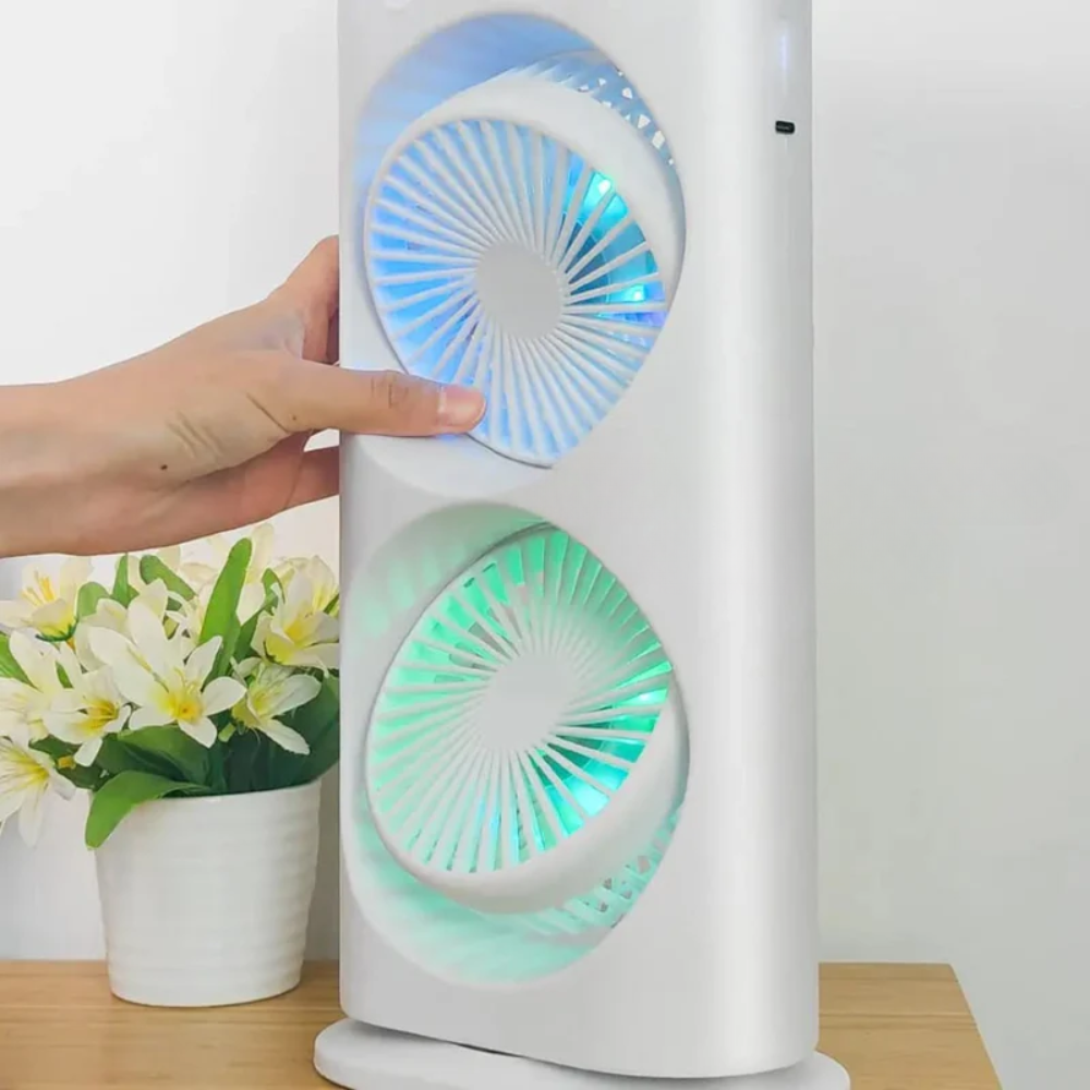 Stay cool anywhere with the Rechargeable Dual-Head Mist Tower Fan, designed for portability, comfort, and style. This versatile Rechargeable Dual-Head Mist Tower Fan features two independently pivoting heads, allowing you to direct airflow exactly where you need it—perfect for desks, bedside tables, nurseries, or dorm rooms.